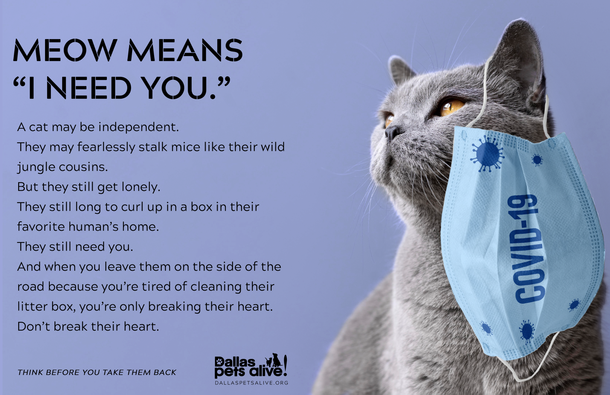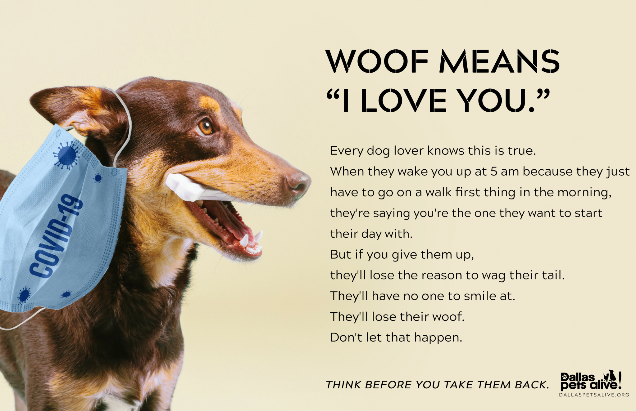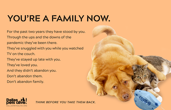 We didn't want that to happen to any of the defenseless animals that depend on us. So we created an awareness campaign. This campaign would remind people of the reasons why they adopted their new furry friends in the first place, and why taking their new pets back would be devastating to the animals. We decided to focus our campaign on the Dallas area, and based it on a potential partnership with Dallas area charity "Dallas Pets Alive!" This organization does extensive work with pets that need rehoming, and even helps provide resources to people that were thinking about giving up their animals. So because of their experience, we thought "Dallas Pets Alive!" was the perfect organization to base our potential campaign around.