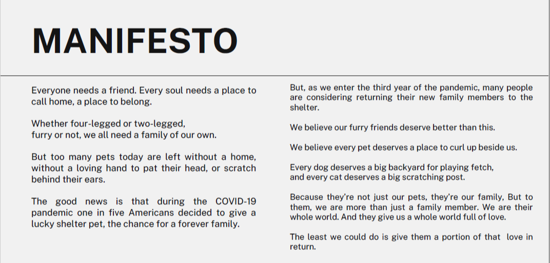 I wrote the manifesto for our campaign. I wanted to create something that would really capture its vision. Something that we could keep close to our hearts as we created each piece of content. I wanted us to remember that we were doing this for the pets that love us unconditionally.