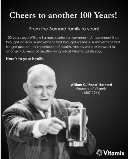 100 years ago William Barnard started a movement. A movement that brought passion. A movement that brought wellness. A movement that taught people the importance of health. And as we look forward to another 100 years of healthy living, we at Vitamix salute you.